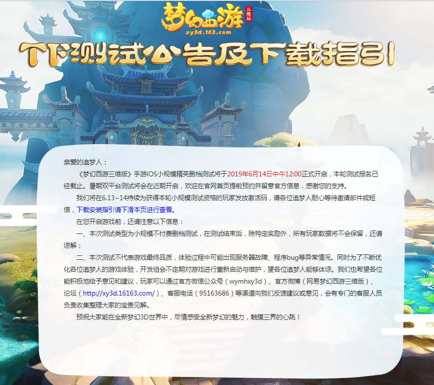 二、本次测试不代表游戏最终品质,体验过程中可能出现服务器故障、程序bug等异常情况。同时为了不断优化各位追梦人的游戏体验,开发组会不定期对游戏进行重新启动与维护,望各位追梦人能够体谅。我们也希望各位能积极地给予意见和建议,玩家可以通过官方微信公众号(网易梦幻西游三维版)、官方微博(网易梦幻西游三维版)、官方玩家交流群:861530716、614210501、186509993、官方论坛(http://xy3d.16163.com/)、客服电话(95163686)等渠道向我们反馈建议或意见,会有专门的客服人员负责收集整理大家的宝贵见解。